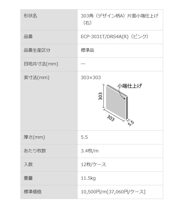 | 商品仕様 | 掲載カタログ 2024エコカラットプラスカタログ 形状名 303角(デザイン柄A) 片面小端仕上げ(右) 品番 ECP‐3031T/DRS4A(R) 実寸法 303×303mm 厚さ 5.5mm あたり枚数 3.4枚/m 入数・重量 12枚/ケース ・ 11.5kg |