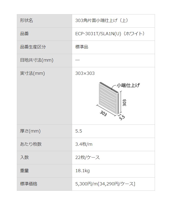 | 商品仕様 | 掲載カタログ 2024エコカラットプラスカタログ 形状名 303角 片面小端仕上げ(上) 品番 ECP‐3031T/SLA1N(U) 実寸法 303×303mm 厚さ 5.5mm あたり枚数 3.4枚/m 入数・重量 22枚/ケース ・ 18.1kg |