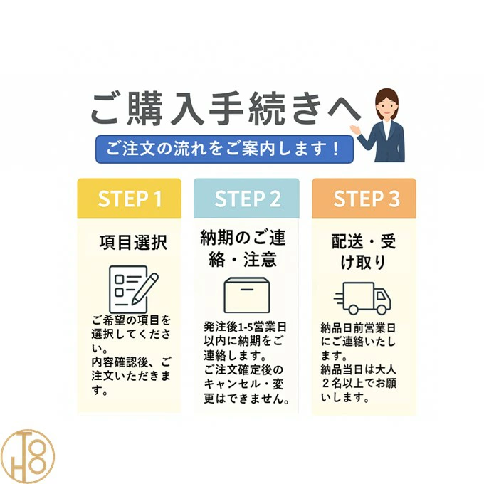注意事項 | 御注文の流れ 1. お客様が当ショップへご注文します。 ・当ショップ確認後、沖縄・離島への配送の場合は、送料確認のお電話またはメールをいたします。 ・「ご注文ありがとうございます」という件名のメールを送らせていただきます。 ・ご入金確認後にメーカーへ発注いたします。 2. メーカーから当ショップへ納期回答が参ります(納期ご連絡:発注後1~5営業日)。 ・当ショップからお客様へお電話して、確認後に納期が確定いたします。 ・「納期のご連絡」という件名のメールを送らせていただきます。 ・電話とメールでの連絡開始から、3日経過しても弊社と連絡がとれない場合には ・納期日が確定せず配送されないので、ご注意ください。 ・ご注文確定後のキャンセル、変更ができないので、ご了承ください。 3. 納品日前営業日、当ショップからお客様へお電話またメールにて連絡致します。 ・「商品発送完了のお知らせ」という件名のメールを送らせていただきます。 4. 納品日当日、商品の受け渡しはドライバー1名で車上渡しとなりますので、※荷受けは、(大人2名以上) 必ずお願いいたします。 ・不在時持ち帰り、保管、再配達料掛かります。 ・お客様がメーカーの配送車から商品を降ろして納品完了致します。 |