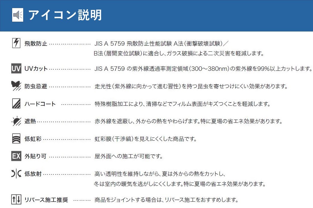 | 商品説明 | 表示金額は10cmになります。 1m以上10cm単位での販売(最低数量=10) キーワード 機能性とデザイン性を兼ね備えた2022-2024年のクレアス ガラスフィルムです。環境配慮型商品のほか、遮熱や飛散防止をはじめとした各種機能性商品に加え、自然をモチーフにした意匠性の高い商品などを収録しています。オフィスやホテル、商業施設をはじめ住宅にも使用できる、ガラスフィルムは全167点のラインアップです。 |